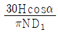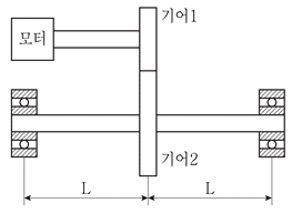 모터 회전속도가 N[rpm]이고 동력 H[W]를 전달받는 평기어 1과 2의 피치원 지름이 각각 D1[m], D2[m]이고 공구압력각이 α일 때 기어 2가 연결된 축을 지지하는 각 베어링의 힘[N]은?