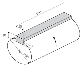그림과 같이 평행키(묻힘키)가 폭 15mm, 높이 10mm, 길이 100mm이며, 지름이 50mm인 축에 걸리는 토크 T=10,000kgfㆍmm일 때 키 홈 측면에 작용하는 압축응력[kgf/mm2]은?