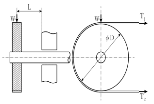 그림과 같이 풀리에 하중 W, 긴장측 장력 T1, 이완측 장력 T2가 작용할 때 옳지 않은 것은? (단, T는 비틀림모멘트, M은 굽힘모멘트이다)