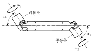 그림과 같이 유니버설 조인트 2개 사이에 중간축을 삽입하여 회전을 전달하고 있다. 한 쪽의 교차각 α1과 다른 쪽의 교차각 α2가 같을 때, 각속도비(