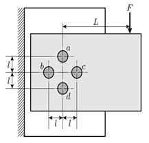 그림과 같은 겹치기 리벳이음에서 편심하중 F가 작용할 때 4개의 리벳 중 가장 큰 전단하중을 받는 것은?