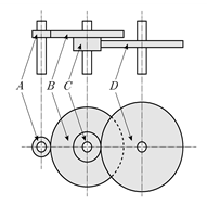기어트레인을 이용하여 기어 D가 연결된 출력축 회전속도 ND[rpm]와 기어 A가 연결된 입력축 회전속도 NA[rpm]의 비