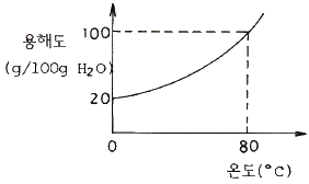 다음 그래프는 어떤 고체물질의 온도에 따른 용해도 곡선이다. 이 물질의 포화용액을 80℃에서 0℃로 내렸더니 20g의 용질이 석출되었다. 80℃에서 이 포화용액의 질량은 몇 g인가?