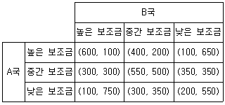 A국과 B국은 전기차 산업 육성을 위하여 수출보조금 지급 전략을 선택한다. 두 국가가 아래와 같이 3개의 보조금 전략과 보수행렬을 갖는 경우, 내쉬균형은? (단, 1회성 동시게임이고, 괄호 안의 왼쪽 값은 A국, 오른쪽 값은 B국의 보수이다.)
