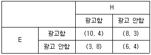 동일한 브랜드의 가전제품을 경쟁적으로 판매하고 있는 두 마트(mart) E와 H는 이윤을 극대화하기 위해 광고 전략을 고려하고 있다. 다음은 두 마트가 전략을 동시에 선택할 경우 얻게 되는 보수행렬이다. 이에 관한 설명으로 옳지 않은 것은? (단, E와 H는 전략을 동시에 선택하고 합리적으로 행동하며 본 게임은 1회만 행해진다. 괄호 안의 왼쪽 값은 E의 보수, 오른쪽 값은 H의 보수를 나타낸다.)