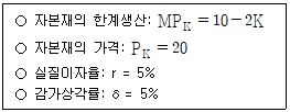 아래 이윤극대화의 원리에 따라 투자수준을 결정하는 신고전파 투자모형(neoclassical model of investment)하에서 기업가가 구입하고자 하는 적정 자본재(K)수준은? (단, 자본재 가격이 다른 상품가격과 함께 상승하고 물가수준은 1 이라고 가정한다.)