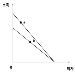 소득-여가 선택모형에서 효용극대화를 추구하는 갑(甲)은 임금률이 10일 때 a를 선택하였고, 이후 임금률이 8로 하락하자 b를 선택하였다. 이에 관한 설명으로 옳은 것은? (단, 여가는 정상재이다.)