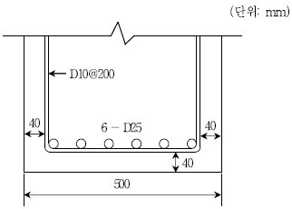 그림과 같은 철근콘크리트 보에서 인장을 받는 6가닥의 D25 주철근이 모두 한곳에서 정착된다고 가정할 때, 주철근의 직선 정착길이 산정을 위한 c값(철근간격 또는 피복두께에 관련된 치수)은? (단, D25 주철근은 최대 등간격으로 배치되어 있고, D10 스터럽의 굽힘부 내면반지름과 마디는 고려하지 않으며, D10, D25 철근 직경은 각각 10 mm, 25 mm로 계산한다)