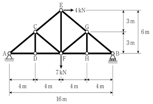 그림과 같은 트러스 구조물에서 부재 DF의 부재력[kN]은? (단, 부재의 인장력은 (+), 압축력은 (-)로 하며, 자중은 무시한다)
