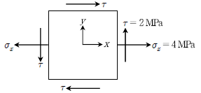 다음 미소 응력 요소의 평면 응력 상태(σx=4MPa, σy=0MPa, τ=2MPa)에서 최대 주응력의 크기는?