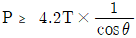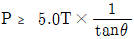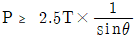 전차선로의 인류용 전주에 설치하는 보통 지선용 재료의 항장력 P(kgf)를 산출하는 식은? (단, T: 수평외력[kgf], θ: 지선과 전주의 각도(°), 지선의 안전율: 2.5)