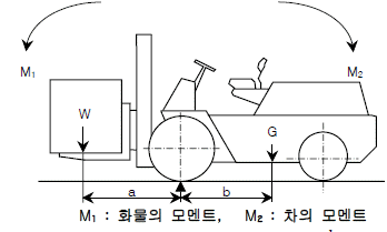 그림과 같은 지게차에서 W를 화물중량, G를 지게차 자체 중량, a를 앞바퀴 중심부터 화물의 중심까지의 최단거리, b를 앞바퀴 중심에서 지게차의 중심까지의 최단거리라고 할 때 지게차 안정조건은?
