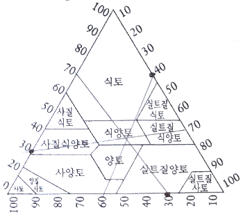 다음 토성구분 3각도에서 모래함량 30%, 점토함량 40%, 실트함량 30%에 해당하는 토성은?