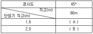 다음 표는 산지 1ha당 경사도별 단끊기 시공 연장표이다. ( )안에 알맞은 계단 연장(m)은? (단, 1ha는 가로 100m, 세로 100m이다.)