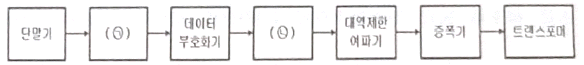 다음 모뎀의 송신부 구성도에서 괄호 안에 들어갈 것으로 바르게 짝지어진 것은?