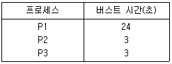 다음은 CPU에 서비스를 받으려고 도착한 순서대로 프로세스와 그 서비스 시간을 나타낸다. FCFS(First Come First Served) CPU Scheduling에 의해서 프로세스를 처리한다고 했을 경우 프로세스의 평균 대기 시간은 얼마인가?