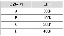 현재 메모리의 분할 상태가 다음과 같을 때 크기가 100K인 작업을 최악적합(Worst Fit)기법에 의해 할당한다면 어느 위치에 적재되는가?