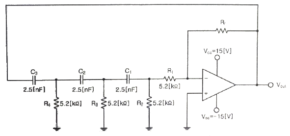 다음의 위상 이동 발진기 회로에서 발진이 지속적으로 유지하기 위한 Rf값과 발진기의 출력주파수(Vout)는 약 얼마인가?