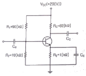 다음 그림과 같은 전류궤환 Bias회로에서 IB는 약 얼마인가?(단, B=100, VBE=0.7[V], Vcc=20[V]이다.)