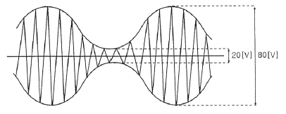 진폭변조(Amplitude Modulation)의 송신기가 그림과 같은 변조파형을 가질 때 반송파전력이 460[mW]이면, 변조된 출력은 몇 [mW]인가?