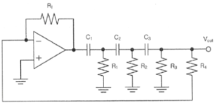 다음 회로에서 정현파를 발생시키는 발진기로 동작하기 위한 저항 Rf의 값은? (단, C1=C2=C3=0.001[μF]이고, R1=R2=R3=10[kΩ], R4=5[kΩ]이다.)