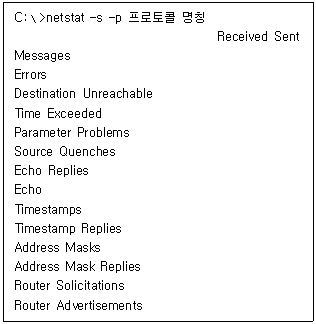 네트워크에 연결된 PC에서 'C:∖>netstat –s –p [프로토콜 명칭]' 명령을 수행한 결과가 모니터에 다음과 같이 표출되었다면, 명령 입력란의 프로토콜 명칭에 해당되는 네트워크 계층(3계층) 프로토콜은?