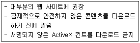 다음은 인터넷 익스플로러의 [인터넷 옵션]-[보안] 메뉴의 신뢰할 수 있는 사이트의 보안 설정에 관한 설명 중 어떤 수준에 해당 되는가?