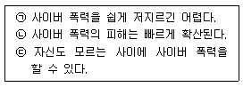다음 <보기>에서 사이버 폭력의 특징에 해당 하는 것만을 모두 고른 것은?
