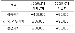 (주)관세는 20x1년 4월 1일에 사용 중인 기계장치와 (주)한국이 보유하고 있는 자동차를 교환하였다. 교환일 현재 두 회사가 소유 중인 자산의 장부금액과 공정가치가 다음과 같고 자동차의 공정가치가 기계장치의 공정가치보다 더 명백하다.