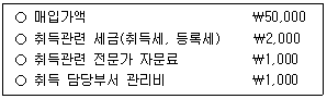 (주)관세는 20x1년 초 임대용 건물을 취득하고 투자부동산으로 분류하였으며, 취득과 관련된 지출은 다음과 같다. (주)관세는 투자부동산에 대하여 공정가치모형을 적용하며 20x1년 말 건물의 공정가치는 ₩52,000이다. (주)관세가 투자부동산과 관련하여 20x1년도에 인식할 손익은?