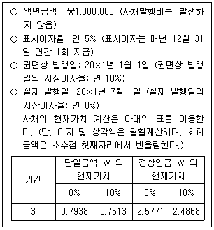 (주)관세는 다음과 같은 조건의 3년 만기 일반사채를 발행하고, 동 사채를 상각후원가로 후속 측정하는 금융부채로 분류하였다.