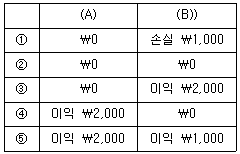 (주)관세는 20×1년 초 지분상품을 거래원가 ₩2,000을 포함하여 ₩52,000에 구입하였고, 이 지분상품의 20×1년 말 공정가치는 ₩49,000이다. (주)관세는 20×2년 4월 초 공정가치인 ₩51,000에 지분상품을 처분하였다. 이 지분상품을 (A)당기손익-공정가치 측정 금융자산으로 인식했을 때와 (B)기타포괄손익-공정가치 측정 금융자산으로 최초 선택하여 인식했을 때 처분으로 인한 당기손익은? (단, 처분시 거래원가는 발생하지 않았다.)