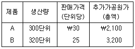 (주)관세는 균등이익률법을 적용하여 결합원가계산을 하고 있다. 당기에 결합제품A와 B를 생산하였고, 균등매출총이익률은 30%이다. 관련 자료가 다음과 같을 때 결합제품A에 배부되는 결합원가는? (단, 재공품 재고는 없다.)