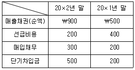 (주)관세의 20×2년도 포괄손익계산서에는 당기순이익 ₩600, 유형자산처분이익 ₩300, 감가상각비 ₩200이 계상되어 있으며, 비교재무상태표의 주요 자산 및 부채 계정은 다음과 같다.