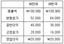 (주)관세와 (주)한국의 공헌이익손익계산서는 다음과 같다.