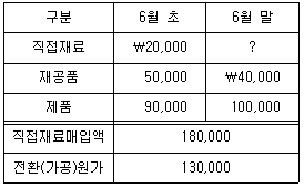 (주)관세의 20×1년 6월 매출액은 ₩400,000이며, 매출총이익률은 25%이다. 원가 관련 자료가 다음과 같을 때 6월 말 직접재료재고액은?