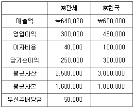 (주)관세와 (주)한국에 대한 재무자료이다. 다음 중 옳지 않은 것은?