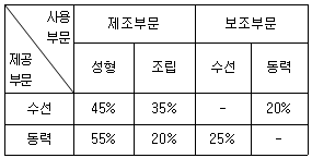 (주)관세는 제조부문(성형, 조립)과 보조부문(수선, 동력)을 이용하여 제품을 생산하고 있다. 수선부문과 동력부문의 부문원가는 각각 ₩260,000과 ₩100,000이며, 각 부문 간의 용역수수관계는 다음과 같다.