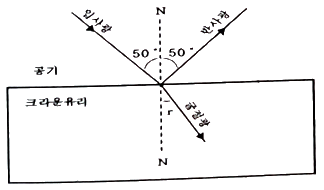 광선이 크라운 유리 표면에 50°의 입사각으로 입사한다. 이 때 굴절광의 각도 r은? (단, 크라운 유리의 굴절률은 1.5 이다.)