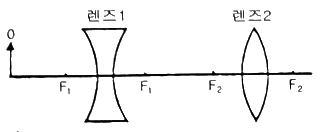 두 개의 렌즈로 이루어진 광학계에서 F1, F2는 초점이다. 0 의 위치에 그림과 같이 물체를 두면 어떻게 되는가?