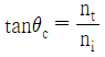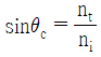 굴절률 ni 인 매질에서 굴절률 nt(< ni)인 매질로 빛이 입사할 때 전반사가 일어나는 임계각 θc에 대한 표현 중 옳은 것은?