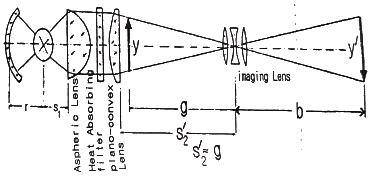 그림과 같은 Projection system에서 결상렌즈의 초점거리는 약 얼마인가? (단, y = 14.1mm, y′ = 1,200mm, b = 4,250mm)
