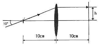 초점거리가 10cm인 볼록렌즈에 그림과 같이 각도 10°로 광선이 입사되는 경우에 렌즈의 초점면에서 이 광선이 교차하는 지점의 광축으로부터의 높이(h)는 약 얼마인가? (단, 근축광선이론을 적용하여 풀이하도록 한다.)