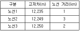 A, B 두 점 간의 고저차를 구하기 위해 3개의 노선을 직접 수준 측량하여 다음 표와 같은 결과를 얻었다면 B점의 표고는?