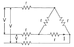 같은 저항 r(Ω) 6개를 사용하여 그림과 같이 결선하고 대칭 3상 전압 V(V)를 가하였을 때 흐르는 전류 I는 몇 A 인가?
