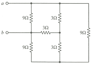 9Ω과 3Ω인 저항 6개를 그림과 같이 연결하였을 때, a와 b 사이의 합성저항(Ω)은?