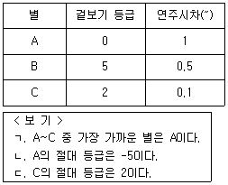 표는 별 A, B, C의 겉보기 등급과 연주시차를 나타낸 것이다. 이에 관한 설명으로 옳은 것만을 <보기>에서 있는 대로 고른 것은?