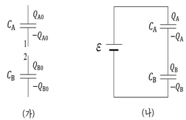 그림 (가)와 같이 전기용량 CA, CB인 축전기에 각각 전하량 QA0, QB0이 저장되어 있다. 그림 (나)와 같이 두 축전기의 단자 1과 2가 연결되고, 기전력 ε인 전지와 연결되어 평형을 이룬 후 전기용량 CA인 축전기에 저장된 전하량 QA는?
