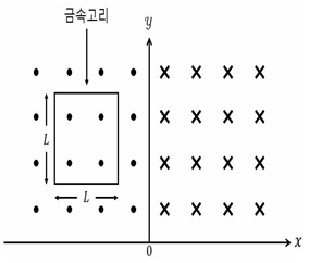 그림과 같이 x축에 수직한 면을 경계로 하여 크기가 일정한 값 B로 균일한 자기장이 ±z축 방향으로 나오고 들어가며, 한 변의 길이가 L인 정사각형 금속고리가+x축 방향으로 등속도 운동하고 있다. 금속고리에 전류가 유도되지 않다가 시간△t 동안만 일정한 전류 I가 유도될 때, 금속고리의 저항은?