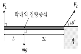 그림과 같이 벽에 닿아 있는 길이 3L, 무게 mg인 막대를 두 사람이 당겨 수평을 유지한다. 두 사람이 당기는 힘의 크기의 비 F1/F2는? (단, 막대의 밀도는 불균일하고, 막대의 굵기와 벽의 마찰은 무시한다.)